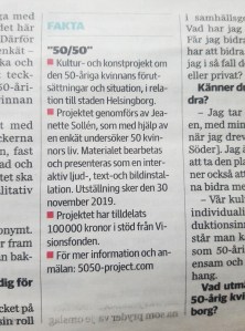 Projektet genomförs av Jeanette Sollén, som med hjälp av en enkät undersöker 50 kvinnors liv. Materialet bearbetas och presenteras som en interaktiv ljud-, text-och bildinstallation. Utställning sker den 30 november 2019.