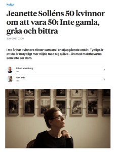 Based on the result of a comprehensive survey aimed at 50 women in Helsingborg, Sweden, at the age of 50, the project presents facts and thoughts from a wide range of topics concerning their lives.